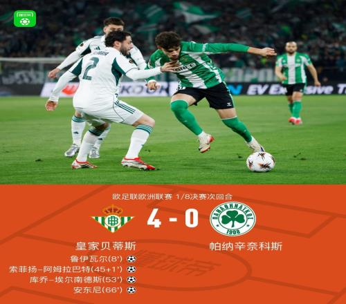 贝蒂斯两回合41帕纳辛奈科斯晋级,鲁伊瓦尔传射,安东尼破门